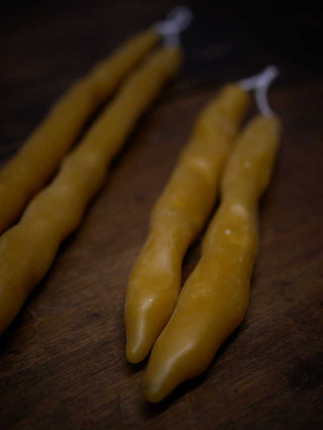 Des bougies trempées et modelées en pure cire d'abeille locale.