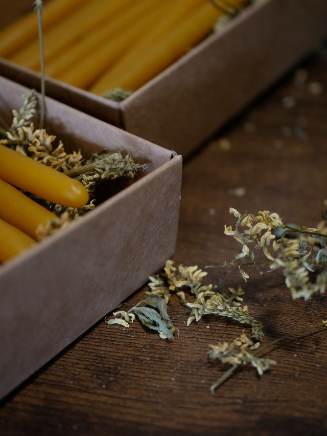 Confectionnées à la main, ces bougies sont fabriquées deux par deux par trempages successifs de la mèche dans la cire chaude.