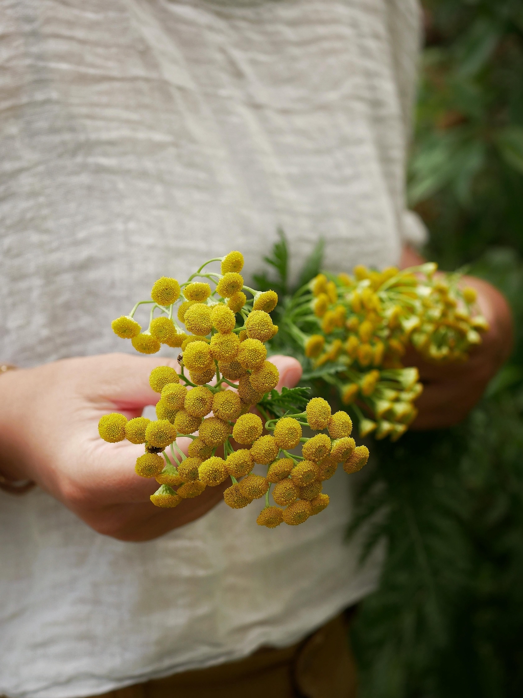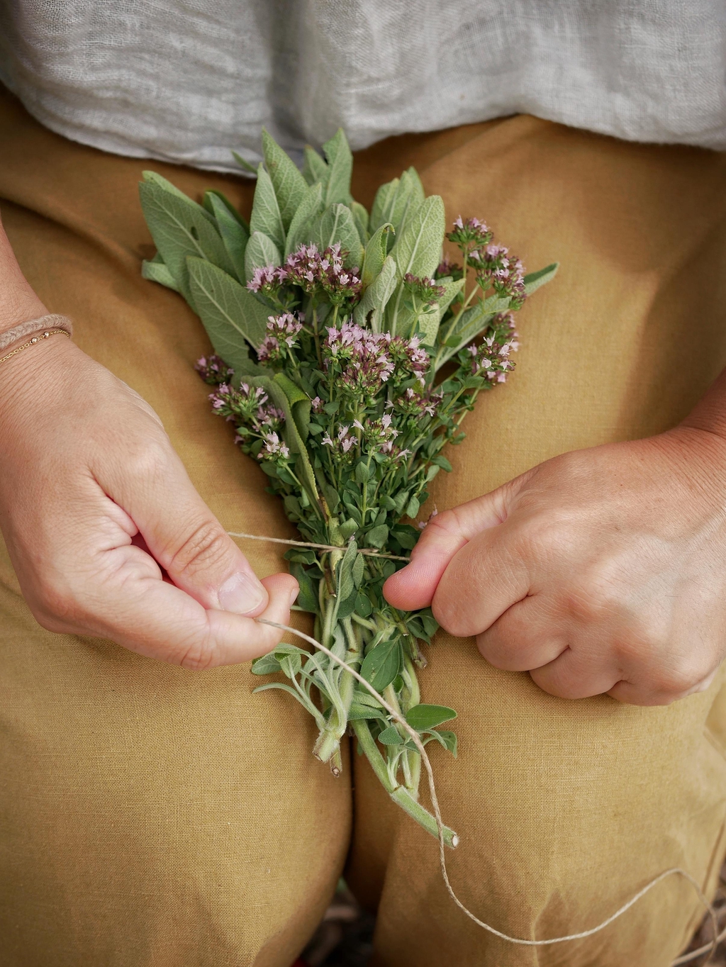 Toujours une base de sauge officinale, lavande, marjolaine, tanaisie, et ficelle de lin naturel, pour lier les plantes entre elles en un bouquet serré.